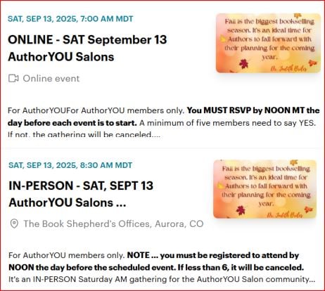 Author Salons are on the second Saturday of each month—they are always the second Saturday of the month details posted below. September will have both ONLINE and IN-PERSON gatherings if enough sign up for them. Remember, if there isn’t a minimum of five participants by Friday afternoon, the session will be cancelled. The Salons are a benefit with AuthorU membership, the next date is Saturday, September 13th