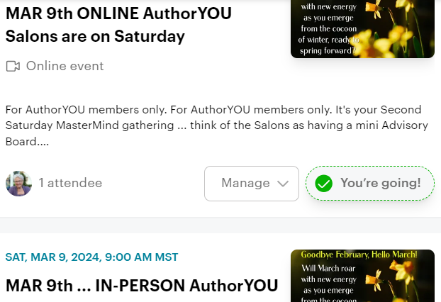 AuthorYOU members … the April second Saturday AuthorYOU Salon is slated for Saturday, the 13th, In-Person and ONLINE only from 7 a.m. to 9 a.m. MT. Remember, there must be a minimum of five participants outside of me if they are registered by Friday noon, the day before. If not, I will cancel. Info is below … you need to be registered to attend. https://www.meetup.com/AuthorYOUSalons/
