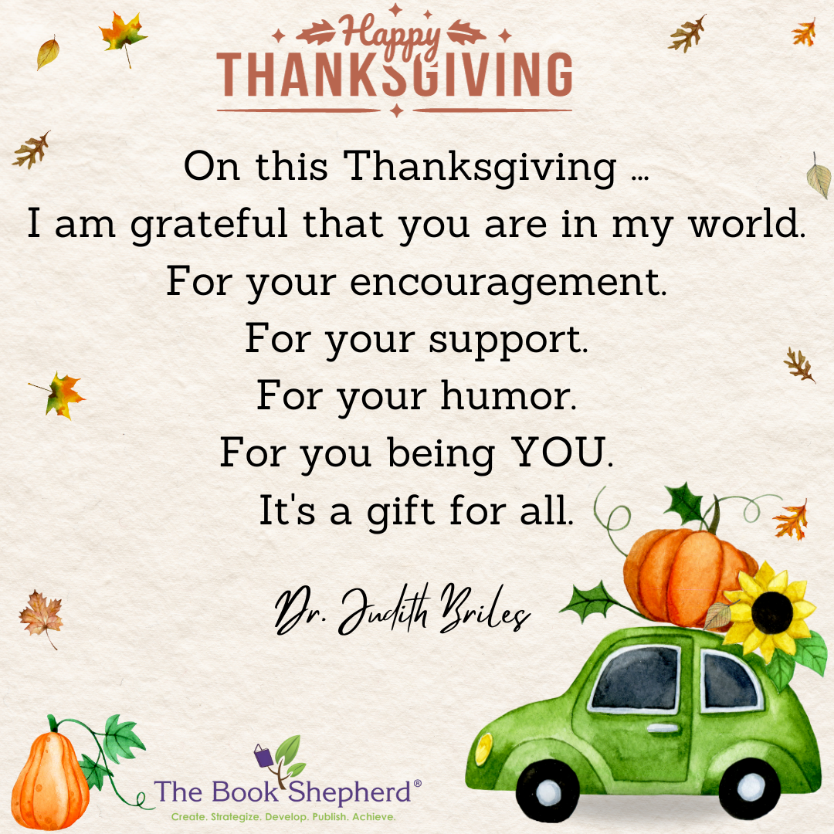 afternoon free for other events. Also—it’s daylight. Perfect. December doesn’t have enough days in it. Details below to register and say “I ... we ... will be there.” I look forward to seeing the AuthorU.org members one more time before the end of the year. If you read my blog this week, it’s all about being human—the Secret Sauce of Gratitude. Read it here: https://thebookshepherd.com/gratitude/.