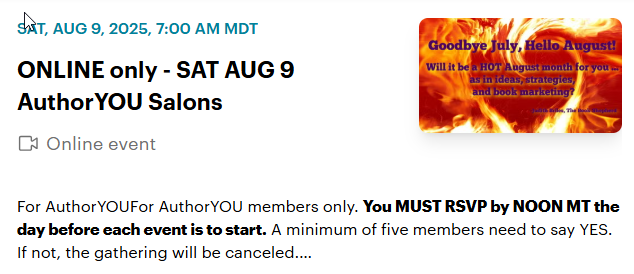 Author Salons are on the second Saturday of each month—they are always the second Saturday of the month details posted below. August 9 ONLINE ONLY if enough sign up for them. Remember, if there isn’t a minimum of