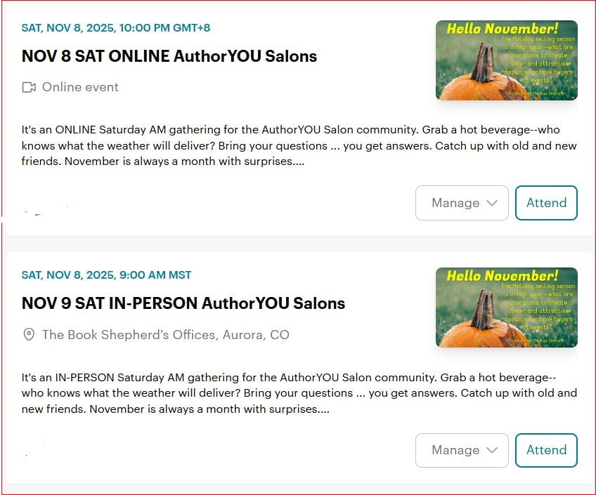 Author Salons are on the second Saturday of each month—they are always the second Saturday of the month details posted below. November will have both ONLINE and IN-PERSON gatherings if enough sign up for them. Remember, if there isn’t a minimum of five participants by Friday afternoon, the session will be cancelled. The Salons are a benefit with AuthorU membership, the next date is Saturday, November 8th