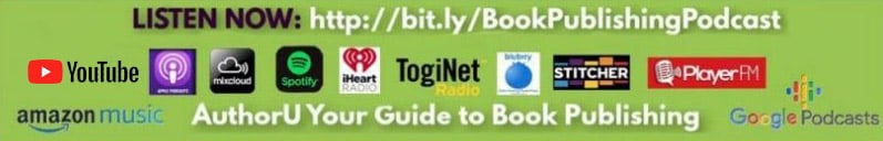 And, if you have listened, support our podcast and post a review. Thank you! The AuthorU – Your Guide to Book Publishing podcast is now heard on eleven podcast channels. How cool is that? Listeners can tune into the weekly (always new – no repeats) show on: