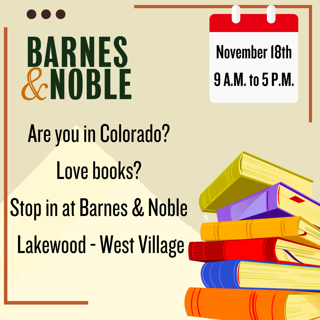 November 18 will be in Lakewood will bring several authors to the Barnes & Noble Lakewood store … we are ready for festive book selling time. It’s a meet and greet with new fans. Next up will be on December 2 at the Southlands Mall location.