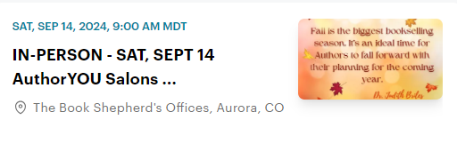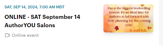 AuthorYOU members … the September 14 second Saturday AuthorYOU Salon is slated for Saturday, the 14th, ONLINE and IN-PERSON.