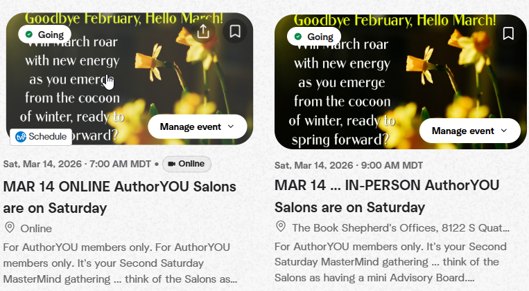 www.meetup.com/authoryousalons/ March 14 will be up next. February is a skip … 27 other authors and I are at sea with the Publishing at Sea cruise from February 15 to 22.