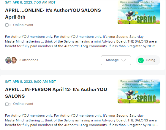 Register for the next few months – The Saturday AuthorYou Salon will be ONLINE only starting at 7 to 8.30am MT. AuthorYou members will be emailed the link on Friday. Salons are a Free benefit for VIP AuthorYOU members only.
