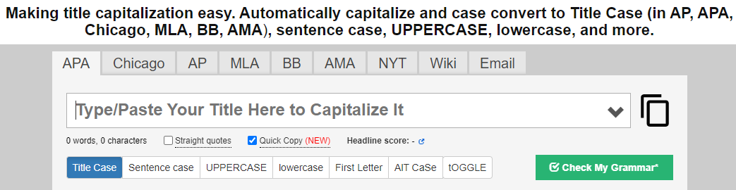 Quick Links: How to Use Capitalize My Title, What to Capitalize in a Title, Title Capitalization Rules by Style (Chicago, APA, MLA, AP, NY Times, Wikipedia)