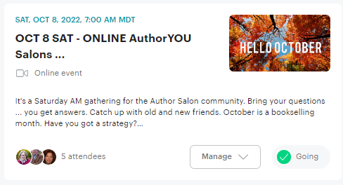 AuthorYOU members … the October second Saturday AuthorYOU Salon is slated for this Saturday, the 8th and is at the ONLINE time only this month, 7 am to 8.30 MT. Remember, there must be a minimum of five participants outside of me if they are registered by Friday noon, the day before. If not, I will cancel. Info is below … you need to be registered to attend. https://www.meetup.com/AuthorYOUSalons/
