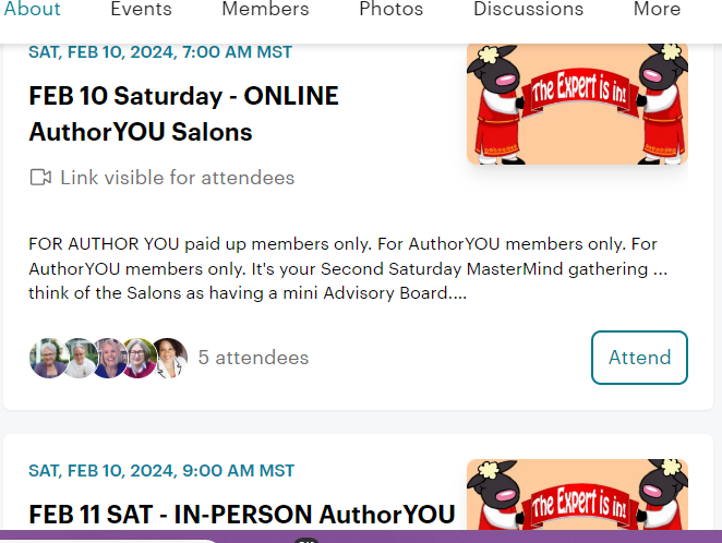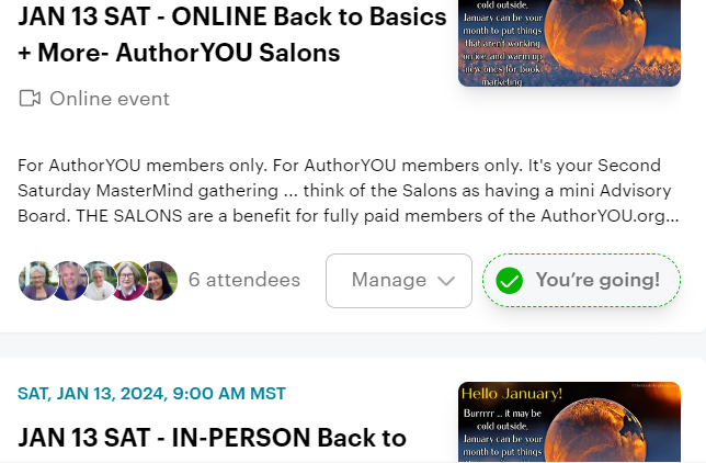AuthorYOU members … the January second Saturday AuthorYOU Salon is slated for Saturday, the 13th, In-Person and ONLINE only from 7 a.m. to 9 a.m. MT. Remember, there must be a minimum of five participants outside of me if they are registered by Friday noon, the day before. If not, I will cancel. Info is below … you need to be registered to attend. https://www.meetup.com/AuthorYOUSalons/