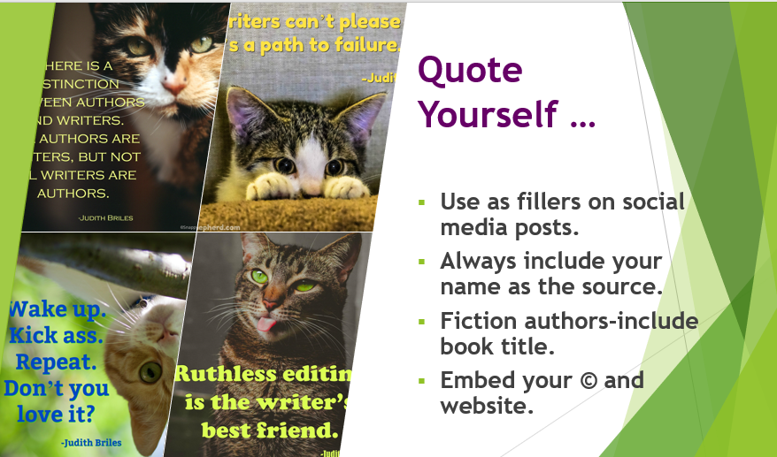 Quote yourself—create posters via Canva and BookBrush. Don’t forget to add your ©, name, website AND that you are the source of the quote. That way, if your posters are retweeted and shared via other social media platform users … you “go along with it with full credit”. It’s a good thing.